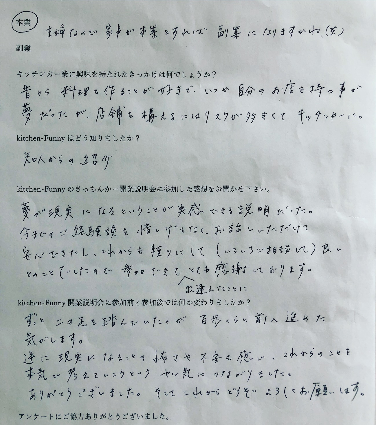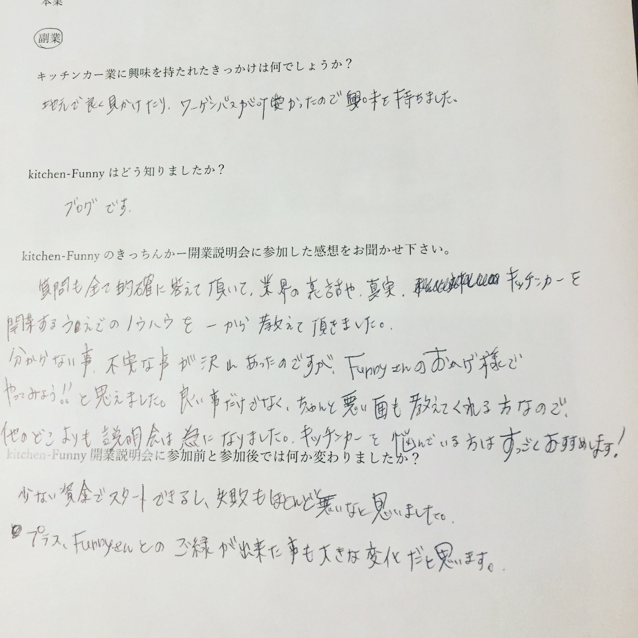 kitchen-Funnyでは、これからキッチンカー業界に参入を考えている方や興味がある方の為に、【キッチンカー開業説明会】を実施しております。 kitchen-Funny開業説明会の最大の魅力ポイント kitchen-Funnyの開業説明会は【個別開催】【マンツーマン開催】での開催!開業するにあたって、不安材料や疑問点は十人十色。大勢でのセミナーなどでは聞きたい事を聞けなかったり、聞きたい内容が話の中に無かったり…せっかく参加しても自分が求めている内容が聞けないのは非常に残念ですよね。自分が聞きたい内容をしっかり聞ける・自分では気づけなかった問題点などもしっかり教えてもらえる!魅力です!
